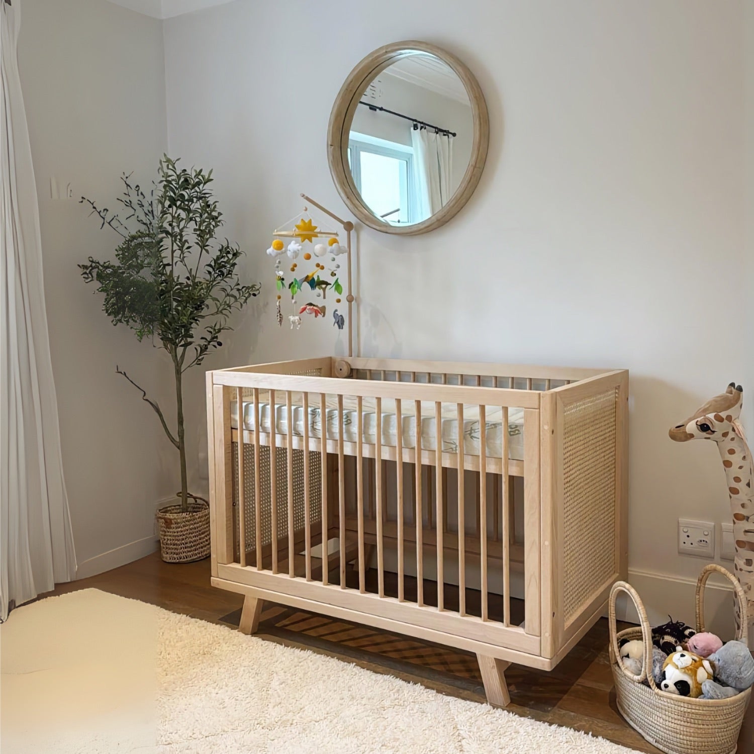 Cot. It includes the Miracle Mary Cot featuring solid wooden frames with natural rattan inserts that give a warm timber finish, adjustable for newborns to standard cot level. This bundle also includes the Miracle Mary Cot Toddler Bed Half Frame, seamlessly transitioning your little one to their first bed. Both items pair perfectly, ensuring easy assembly and extending the life of your baby's cot into their toddler years. A practical, stylish choice for your nursery. Comes in sustainable sourced SA pinewood or imported beechwood (as seen above) and finished off with a child-friendly water-base clear sealer.